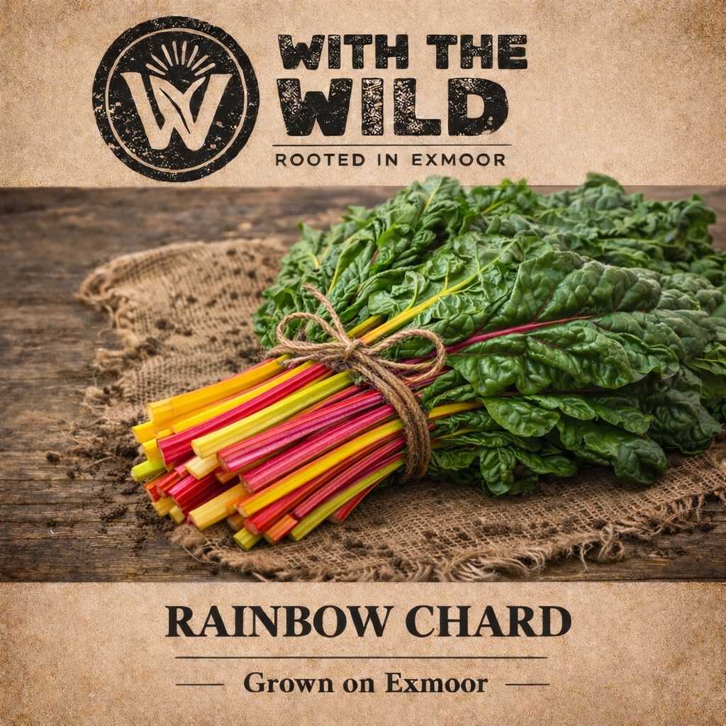 Rainbow Chard – Grown on Exmoor Vibrant, nutrient-rich and freshly harvested from our Exmoor market garden, our rainbow chard brings both colour and flavour to your kitchen. With tender dark green leaves and striking stems in shades of red, yellow, and gold, it’s as beautiful as it is versatile. Perfect for sautéing, adding to soups, or enjoying simply steamed with a drizzle of olive oil, rainbow chard has a mild, earthy flavour similar to spinach with a slightly sweet crunch in the stems. Grown using organic, stock-free methods, our chard is harvested fresh to retain maximum flavour and nutrition. Seasonal, local, and rooted in Exmoor.