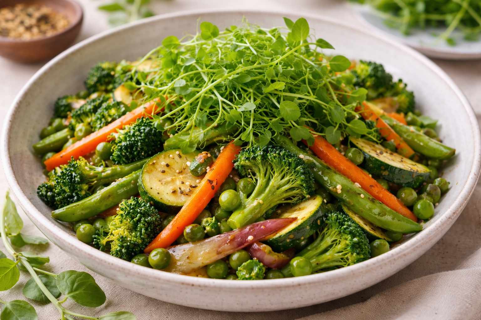 Easy quick, vibrant stir fry celebrating the abundance of tender spring leaves. This is a flexible “use what’s growing” recipe — perfect for veg boxes and seasonal cooking.